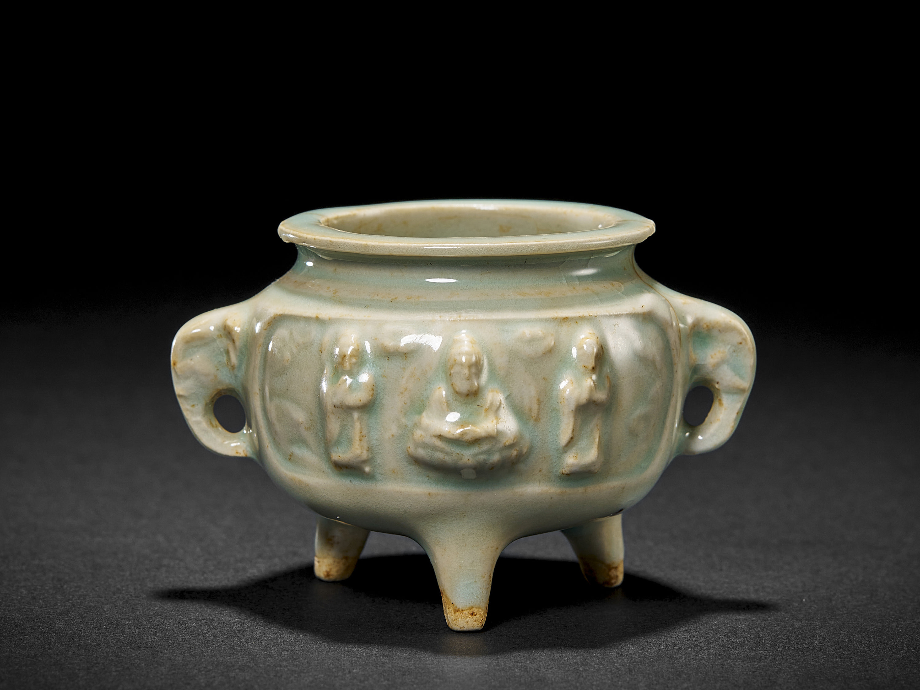 1074青白釉贴塑一佛二弟子象耳炉