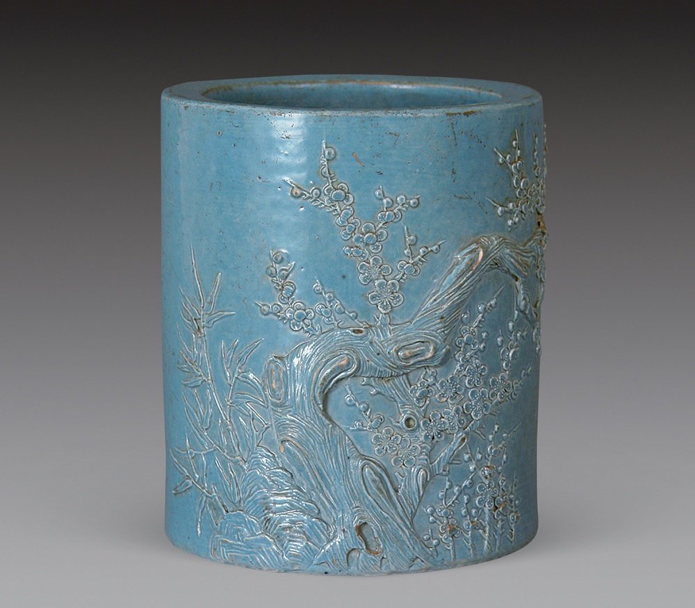 096清光绪 炉钧釉堆雕梅竹笔筒