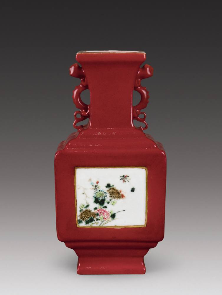 胭脂水釉开光粉彩双螭耳四方瓶